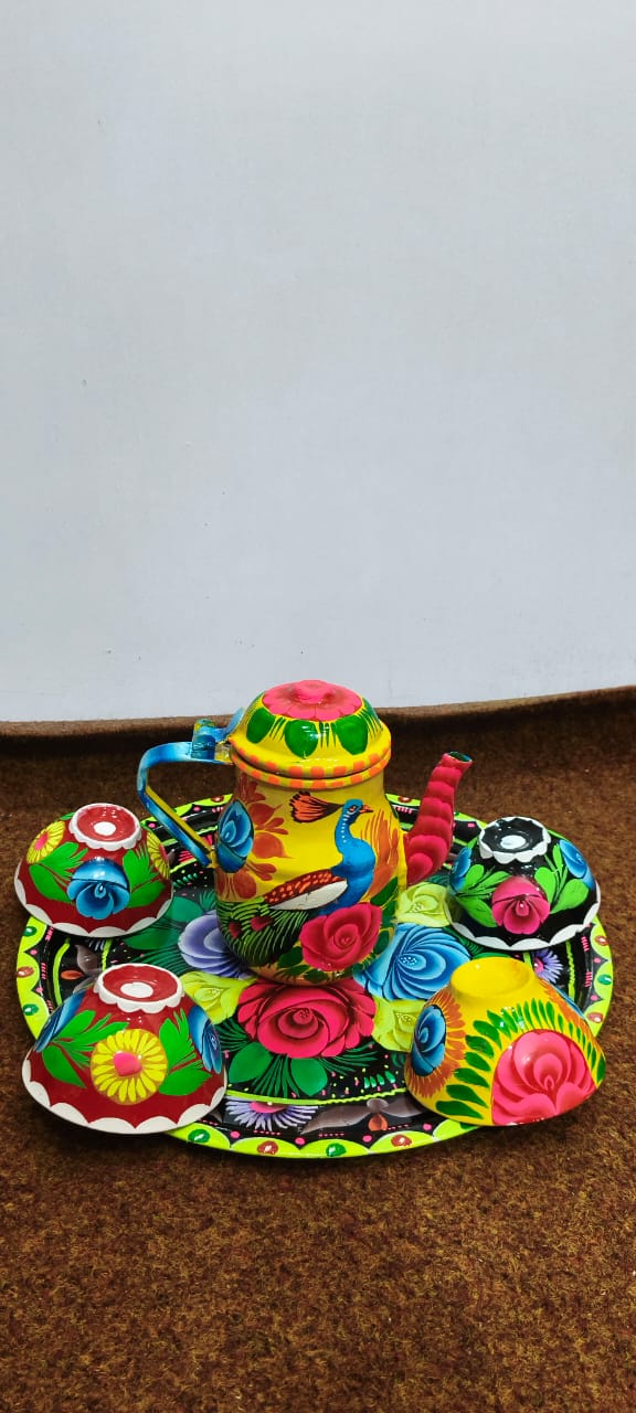 ✨ Large Cattle 4 Cups & Tray Set – Vibrant Hand-Painted Truck Art Design | Traditional & Colorful Serving Set